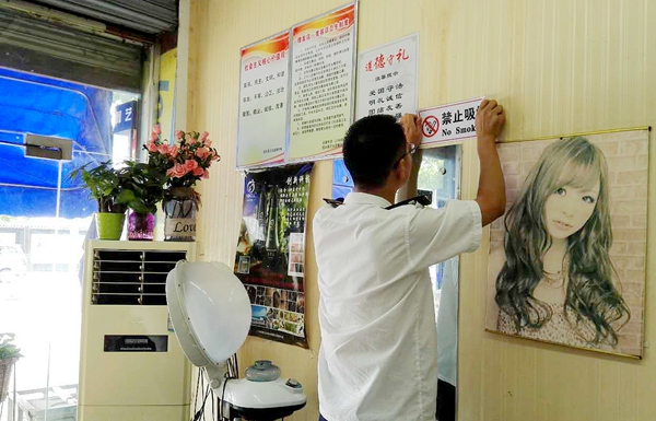 巡查中,执法人员为所有理发店张贴了社会主义核心价值观公益广告、行业管理制度、“禁止吸烟”标牌及“尊德守礼”提示牌,公示群众监督电话,要求经营户做到亮证经营,从业人员持有有效健康证,落实用品用具消毒制度;对于刚开业及许可证过期的几家理发店,下达了办证通知书,限期办理公共场所卫生许可证;对拖延、拒绝办理卫生许可证的经营户给予行政处罚,并将不定期加大巡查力度,确保创建工作顺利进行。(范文洪、鲍金鸽)